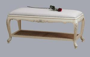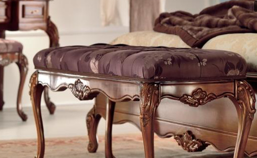 Следует подбирать изысканные модели мебели с ножками из дерева, покрытыми лаком. Обивка выбирается богатая, но сиденье может быть плетёным, что придаст большей оригинальности интерьеру спальни. Зачастую материалы намеренно состаривают.