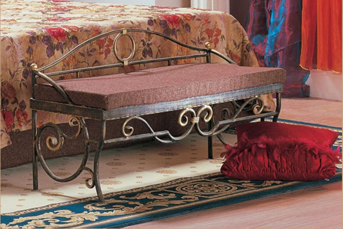 Мебель с коваными элементами обычно изготавливают на заказ, но в свободном доступе такие модели тоже есть. Для использования в спальне можно найти самые различные виды кованых банкеток: на разное количество мест, с полочкой и без, с разным видом обивки.