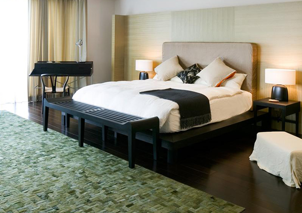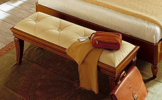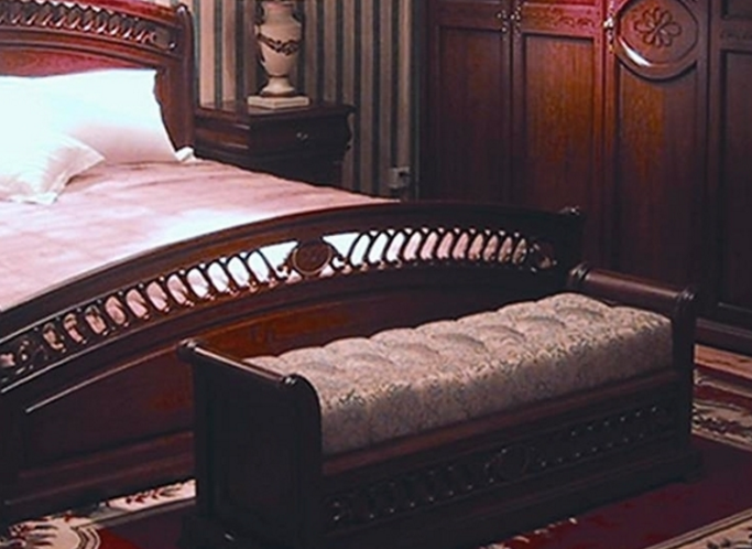 Может дополнить и украсить строгая скамья. Обивка не должна быть броской. Форму ножек изделия нужно выбирать схожие с ножками кровати.