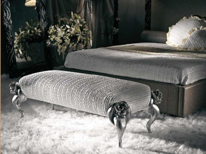 Металл – для дополнения интерьера спальни часто используют модели из металла. Для изготовления такой мебели применяют бронзу и железо. Железо используют для изготовления непосредственно каркаса банкетки, а из бронзы изготовляются украшения.