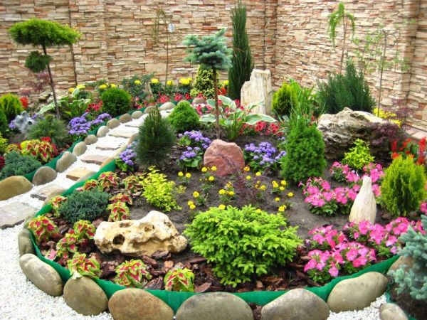По месторасположению растения компонуют с особенностями. Основная часть влаги будет у подножья, и там сажают влаголюбивые растения, на вершине же размещают не требовательные к влажности цветы. Красиво дополняют композицию стелющиеся растения и хвойники.