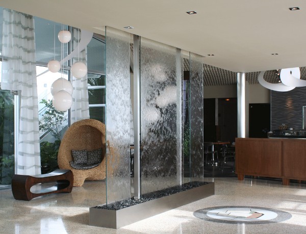 Строгие водопады нередко можно видеть в различных офисных зданиях. Как правило, они изображают закрытые системы за застекленным куполом. Конструкция их такова, что по отвесной поверхности очищенная вода постоянным ручьём съезжает книзу.