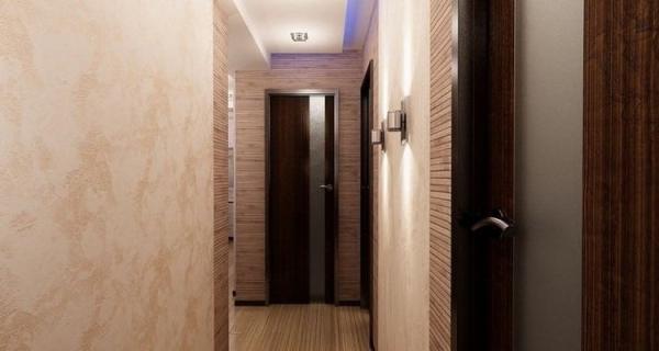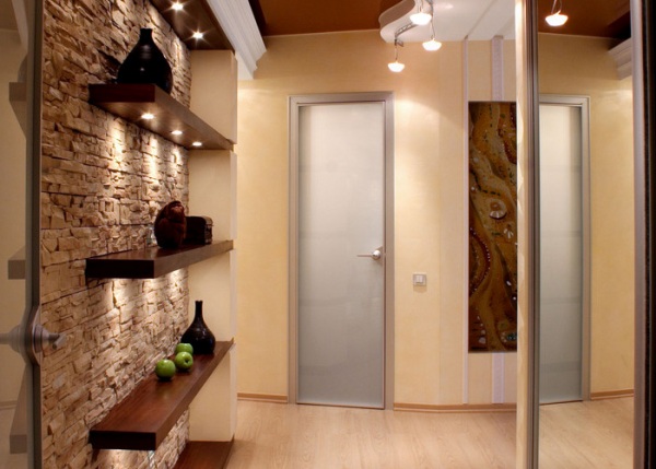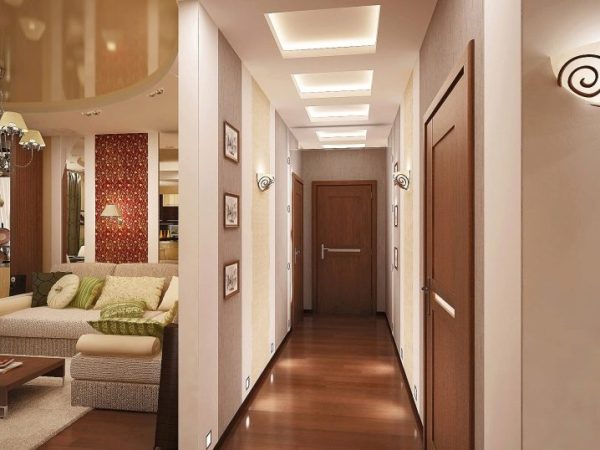 Немаловажно уделить внимание и освещению. Нужно установить на потолке несколько светильников. Это могут быть люстры, лампы, точечное освещение – подбираться осветительные приборы, отталкиваясь от общего стиля коридора. Не лишними будут и бра – от них лучи будут равномерно распределяться по помещению. Поверьте, удвоить свет – это отличное решение, порой его бывает достаточно, чтобы небольшое помещение смотрелось иначе.