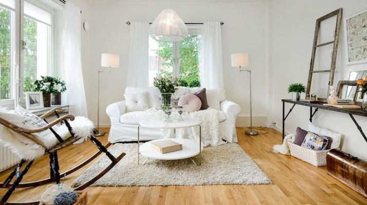 - декоративных элементов разрешено много, но их задача – не только создание уюта, а и выполнение практических задач (пледы, диванные подушки, светильники, зеркала, комнатные растения и даже велосипед);