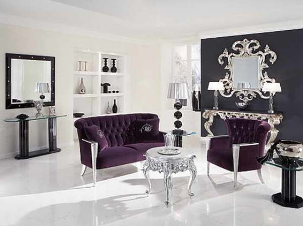 Стены визуально разделяются на несколько участков, лепниной или резными панелями. Сегменты декорируются обоями под дорогую ткань, а также зеркалами, настенной живописью, гобеленами, картинами.
