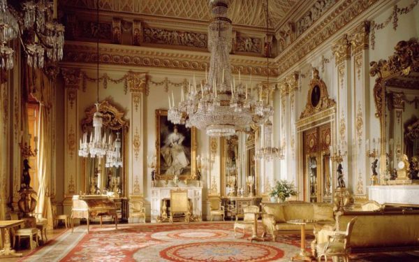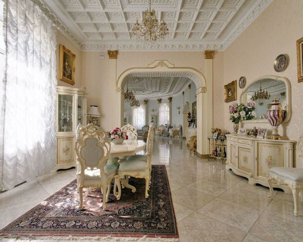 Для этого стиля, потолок – это пятая стена. Его разбивают на секции, украшают лепными элементами, которые переходят на стены. Окрашивают лепнину в золотой либо в белый цвет. В центре потолка вешается люстра с хрустальными подвесками и лампами в виде свечей. Углы между стенкой и потолком скругляются падугой.