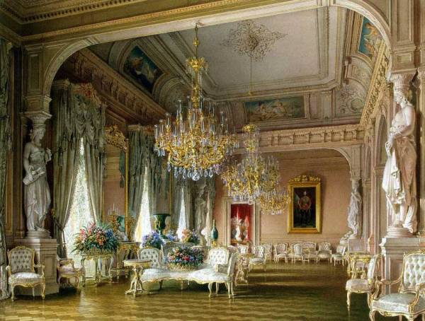 Белые и пастельные тона, розового, зелёного или голубого – это главные цвета стиля рококо. Позолота присутствует во всех деталях интерьера.