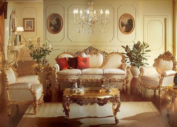 Чтобы подчеркнуть атмосферу роскоши, мебель выбирается с изогнутыми ножками, украшенную резьбой с цветочными гирляндами, амурами и позолотой. В интерьере используются кресла и канапе с подушками, мягкие кушетки, стулья, скамеечки. Камин, в стиле рококо, играет декоративную роль. На мраморной каминной полке, выставляются изящные безделушки, вазы, старинные часы. Над камином, должно красоваться зеркало или картина.