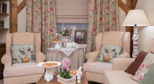 В гостиной необходимо создать обстановку, располагающую к общению и отдыху. Здесь важно, чтобы ткани хорошо сочетались с узорами и орнаментами на стенах, находились в одной цветовой гамме. Хотя отклонение на несколько оттенков допустимо и даже приветствуется — так ткани не будут сливаться со стенами.