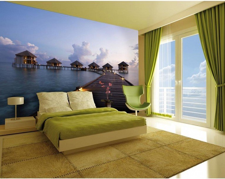 Важен размер фотообоев по отношению к габаритам спальни и количеству мебели, находящейся в ней. Если комната небольшая либо содержит густую мебельную обстановку, хорошим решением станут изображения панорамы: они помогут визуально расширить комнату, сделав ее просторней.