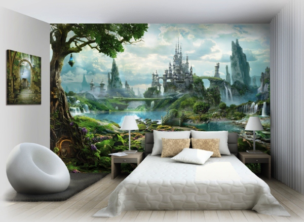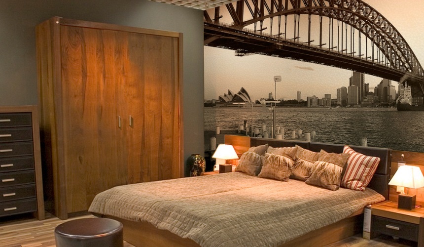 Фотообои, повешенные над кроватью в спальне, легко сделают интерьер интереснее, необычнее и затейливее. Именно поэтому подобный вид внутренней отделки становится всё популярнее.